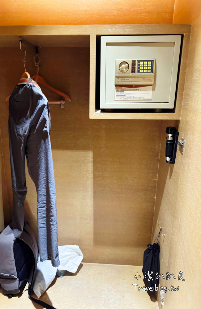 衣櫃內有保險箱、行李架、拖鞋、吹風機都非常齊全。