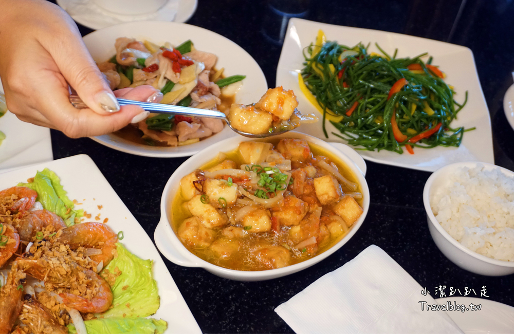 來看看我們吃這樣一桌雙人餐:蟹黃豆腐、山藥排骨湯、宮保雞丁、麻香松坂豬、椒鹽鮮蝦、清炒水蓮